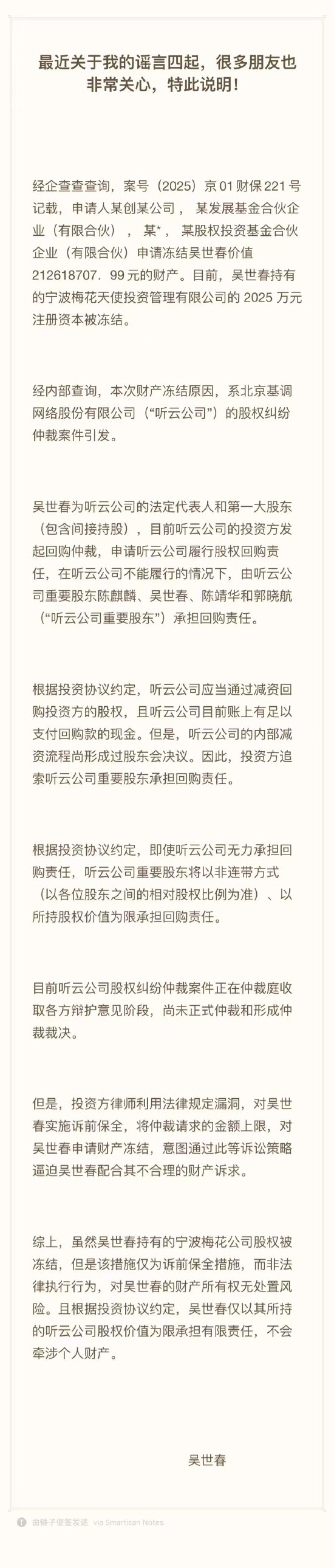 今日下午,吴世春正式发布声明回应此事。吴世春表示,经企查查查询,案号(2025)京01财保221号记载,申请人某创某公司,某发展基金合伙企业(有限合伙) 天猫配资,某*,某股权投资基金合伙企业(有限合伙)申请冻结吴世春价值212618707.99元的财产。目前,吴世春持有的宁波梅花天使投资管理有限公司的2025万元注册资本被冻结。