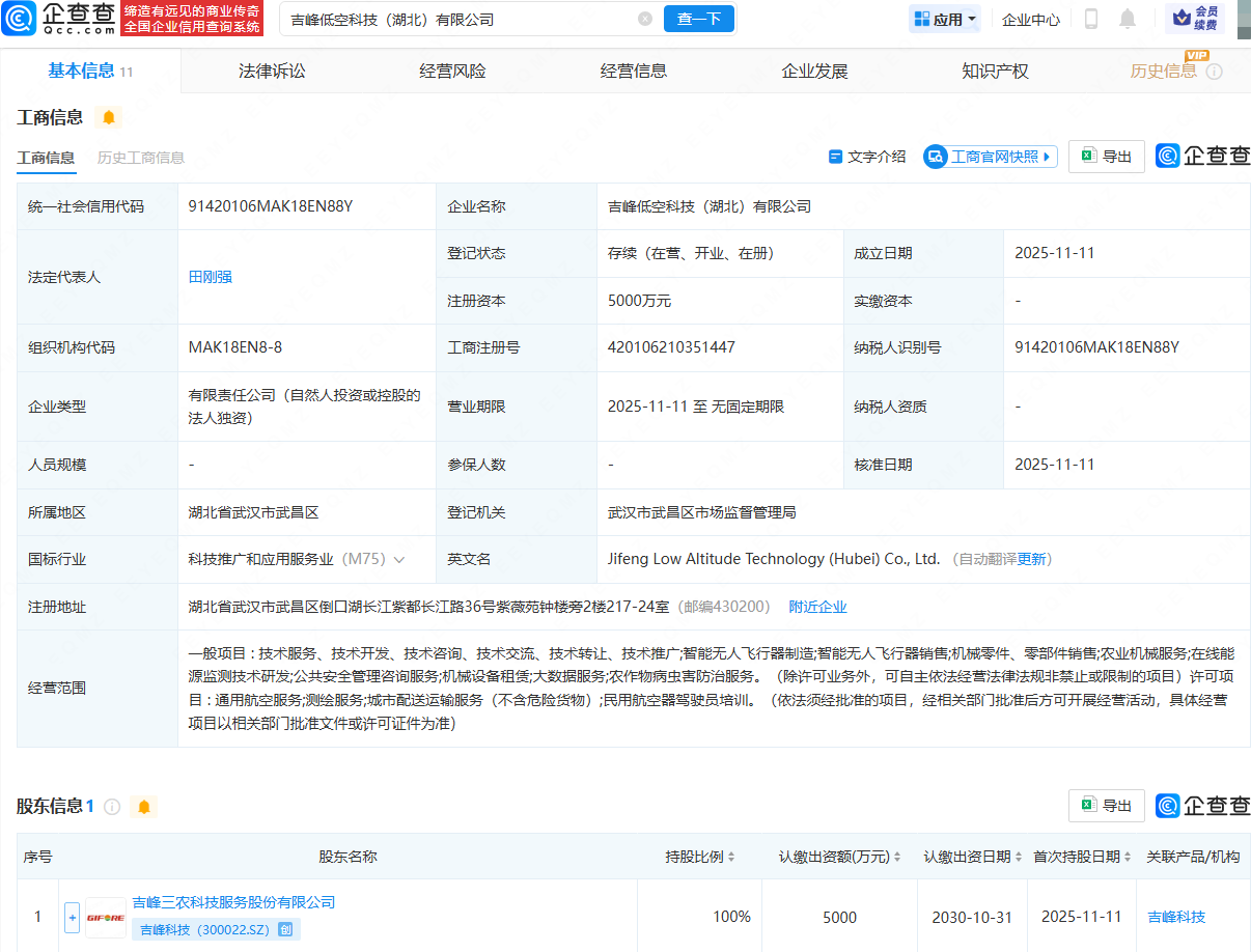 近日,吉峰低空科技(湖北)有限公司成立,法定代表人为田刚强,注册资本为5000万元,经营范围包含:智能无人飞行器制造;智能无人飞行器销售;通用航空服务;测绘服务;民用航空器驾驶员培训等。企查查股权穿透显示,该公司由吉峰科技(300022)全资持股。